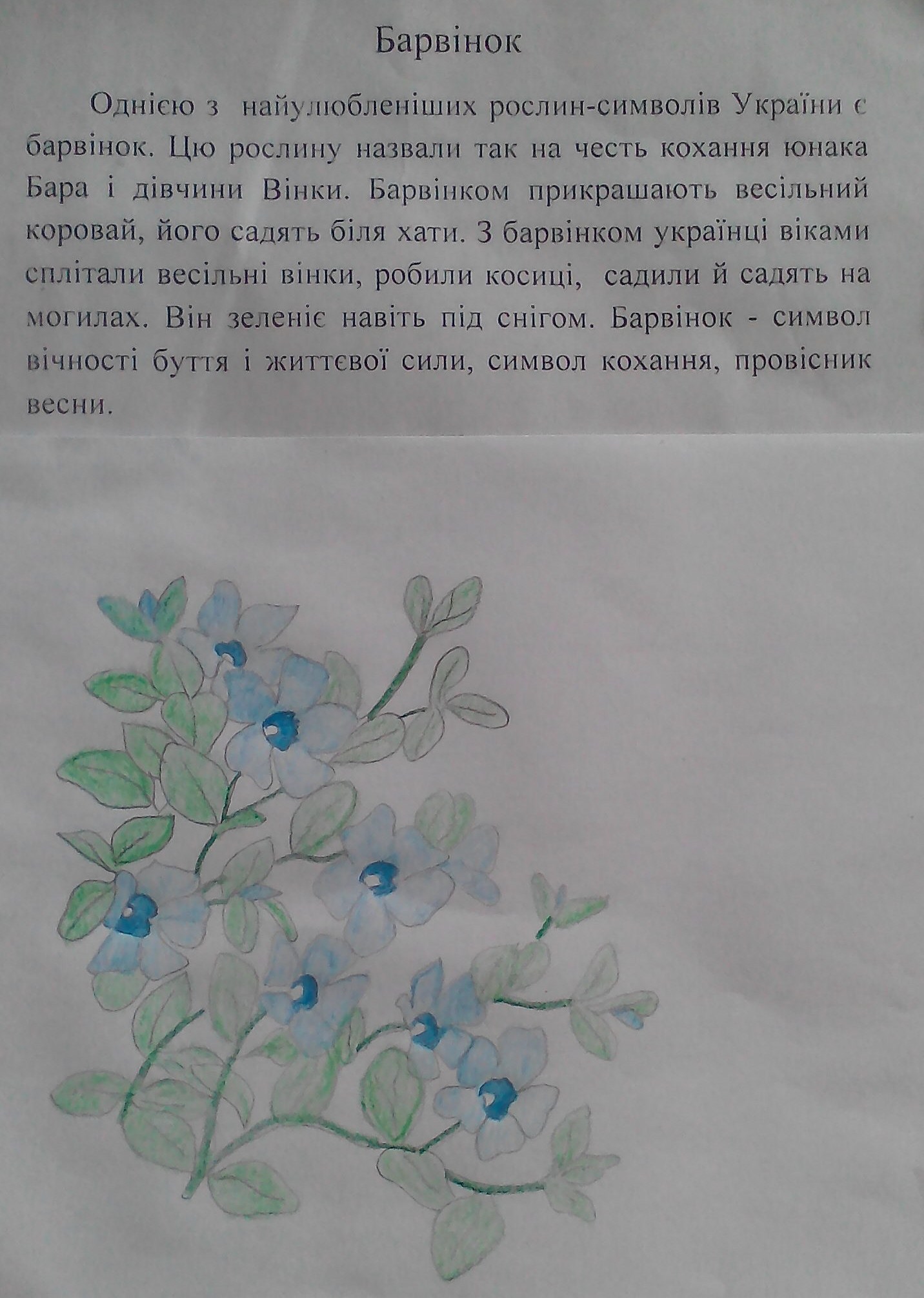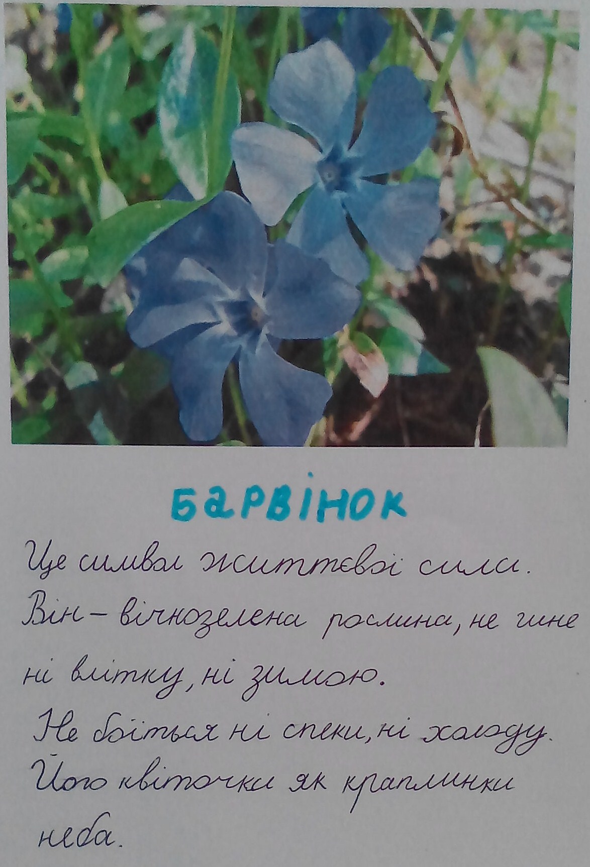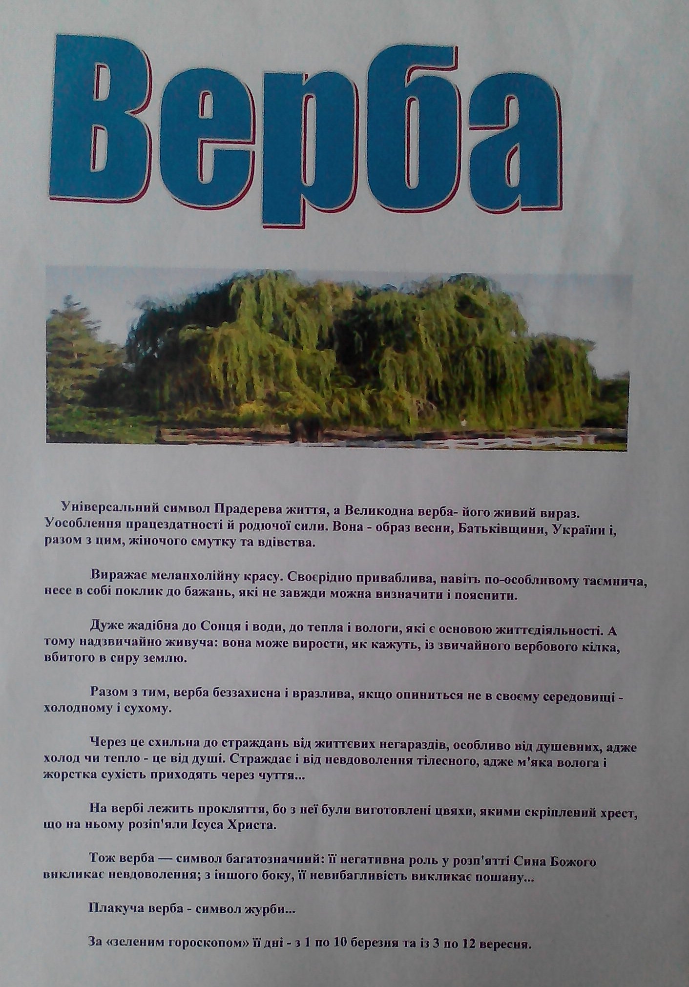 Про вербу, калину, тополю, барвінок, дуб і чорнобривці описала і розповіла Мазур Марія: